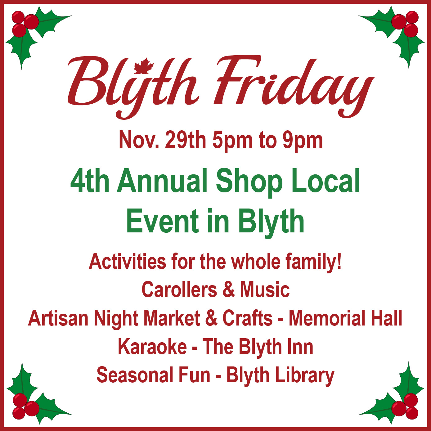 Blyth Friday is a shop local event with activities for the whole family. Enjoy carollers, a night market, a scavenger hunt, crafts, special treats and activites throughout the village of Blyth. Memorial Hall and Stores open until 9pm.