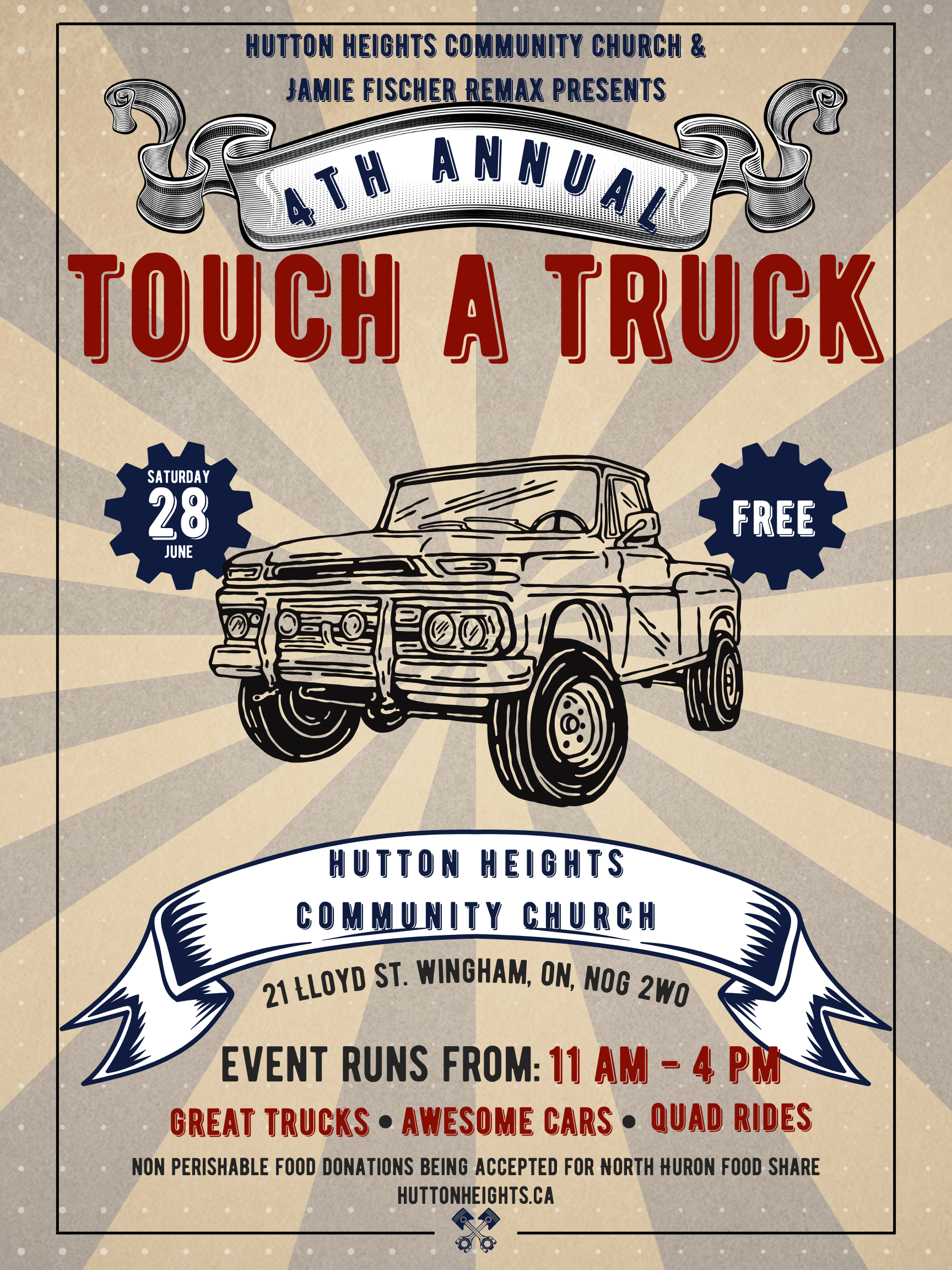 Hutton Heights Community Church and Jamie Fischer ReMax are partnering to bring you our 4th Annual Touch A Truck. This is a day of fun where you and your kids can sit in an amazing truck, vehicle, tractor, and cool cars. This year we have a helicopter flying in. There will be quad rides and kids side-by-side rides available. Face painting provided by The Faith Mission Canada, and Brammy's Food Truck will be on site as well. Please bring in food or money donations to help build up the North Huron Food Share.