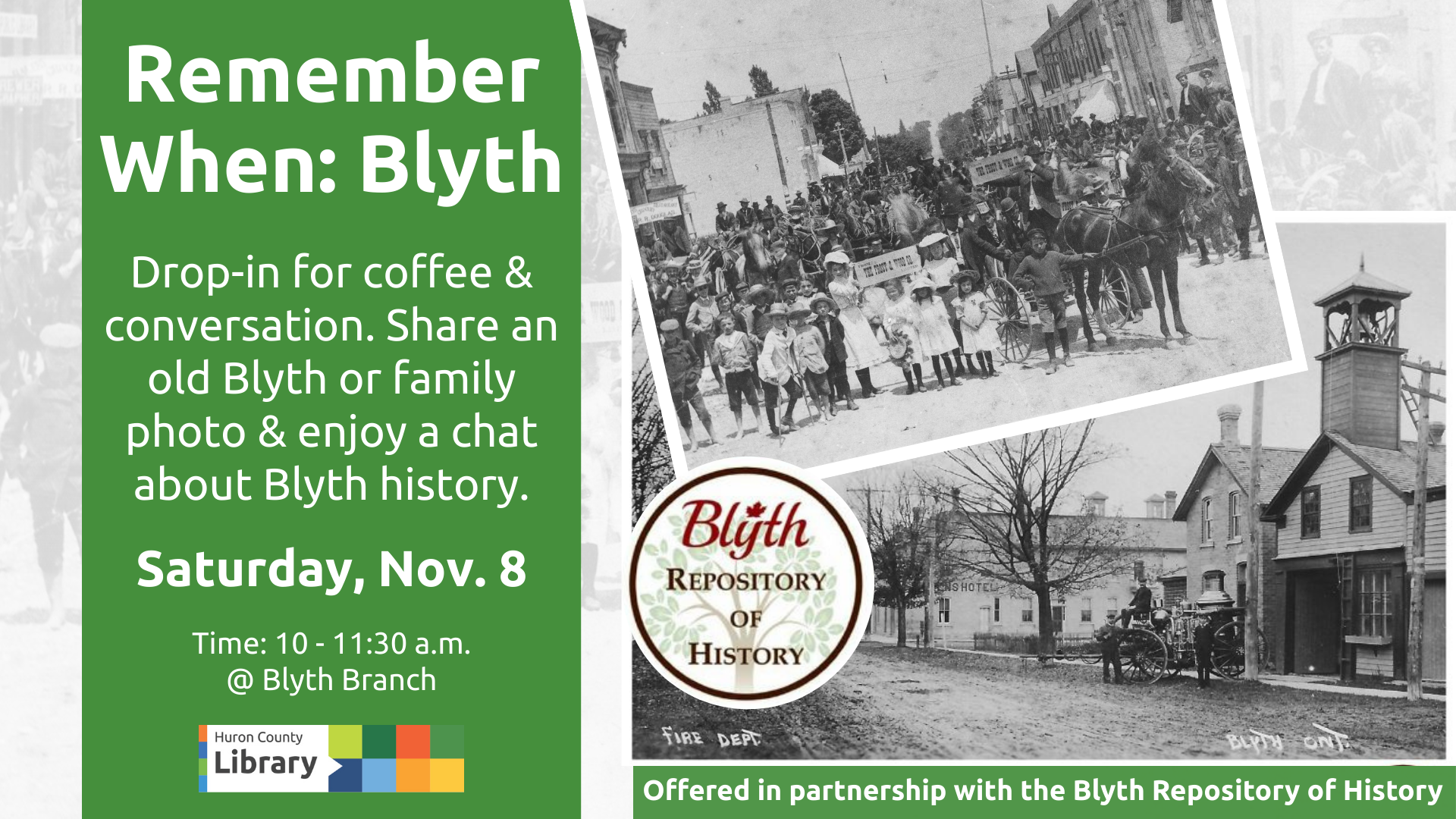 Join us at the Blyth Branch for coffee and conversation about Blyth’s history. Consider bringing along old family pics, landmarks and historical buildings to spark conversation.